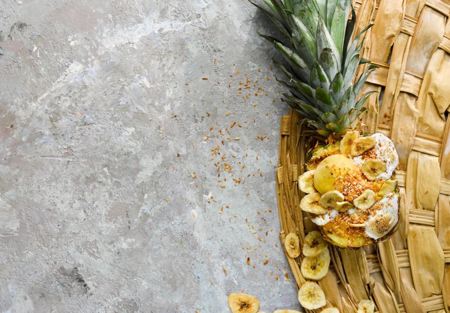 4. Drizzle with passion fruit, crushed banana chips and toasted coconut